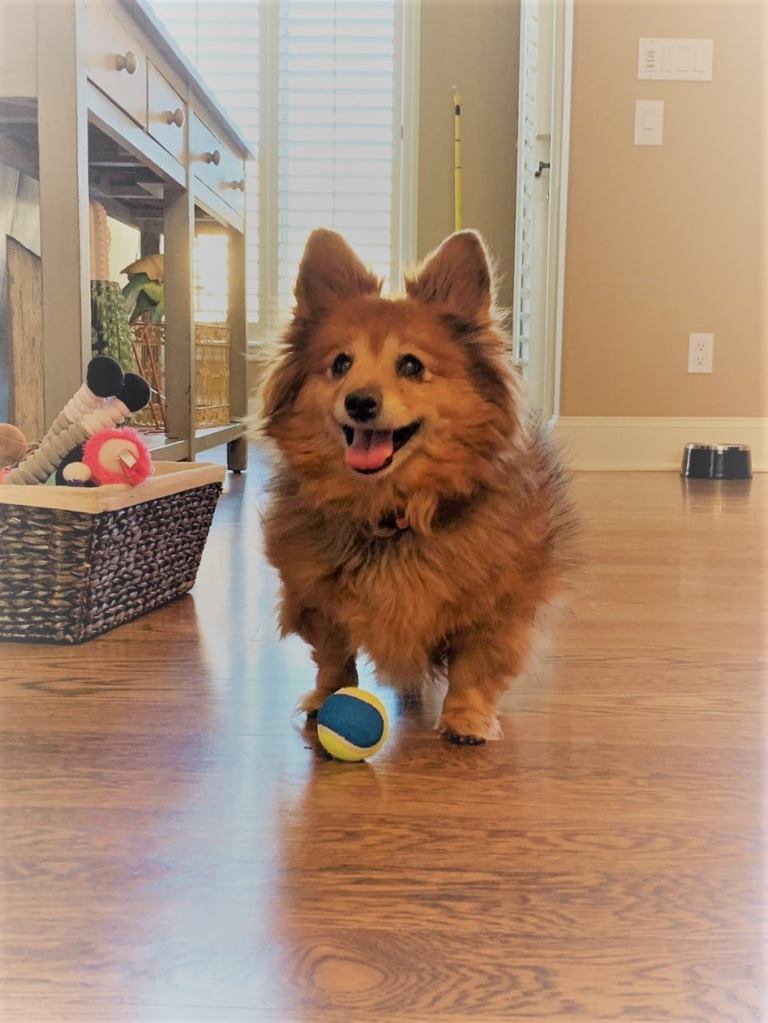 Our beautiful gal in this photo is 14-year-old Mia. She is primarily red with black accent Pomeranian/Dachshund mix missing quite a few teeth requiring a primarily soft food diet and heart murmur level 3 which will require some watching but not medication at this point. She will play ball with her squishy pineapple for as long as your arm can last, cuddle you into a state of sleepiness and give you little licks of love. Oh, and hide the treat bag! She knows what the bag looks like! She is my first rogue foster where I didn’t wait for approval from the shelter, I knew what I had to do.